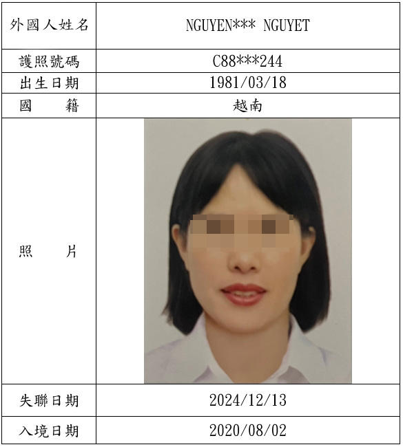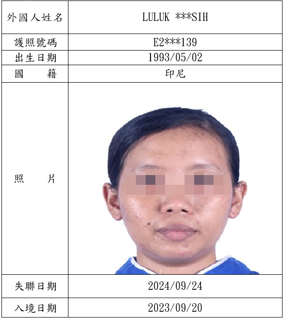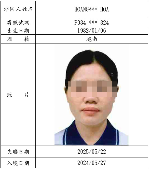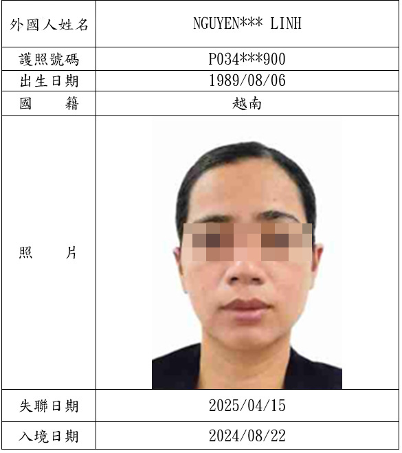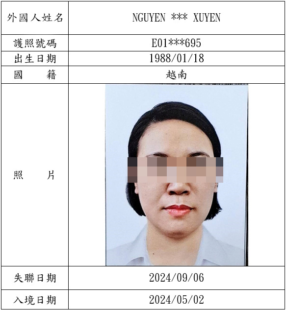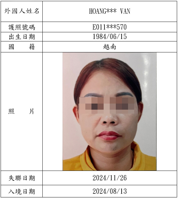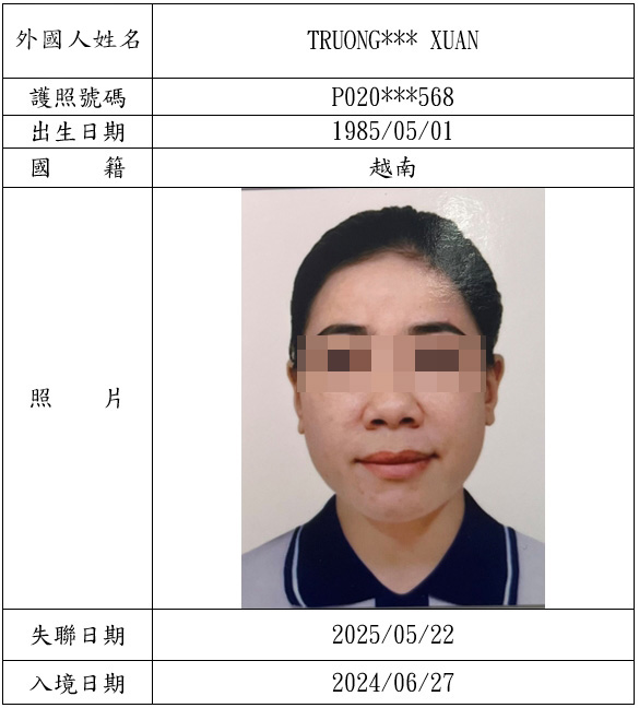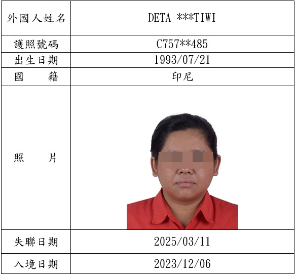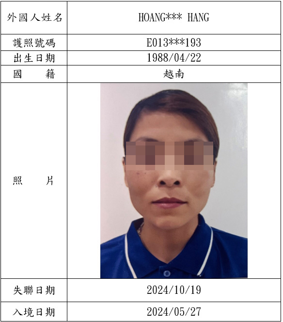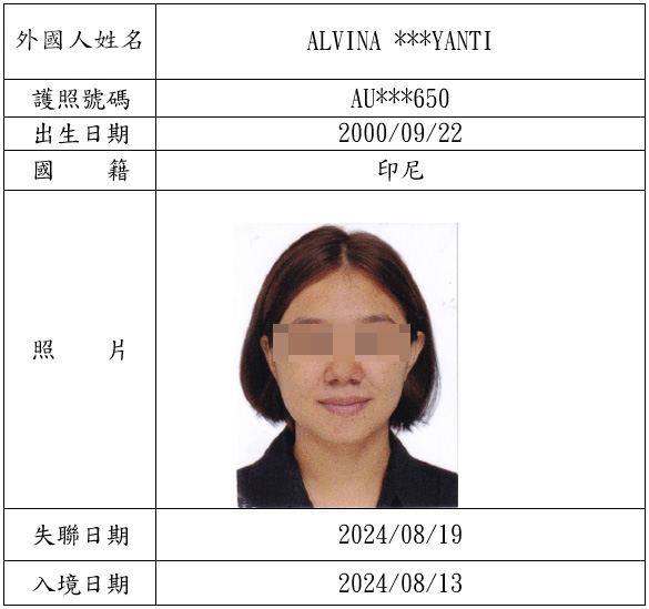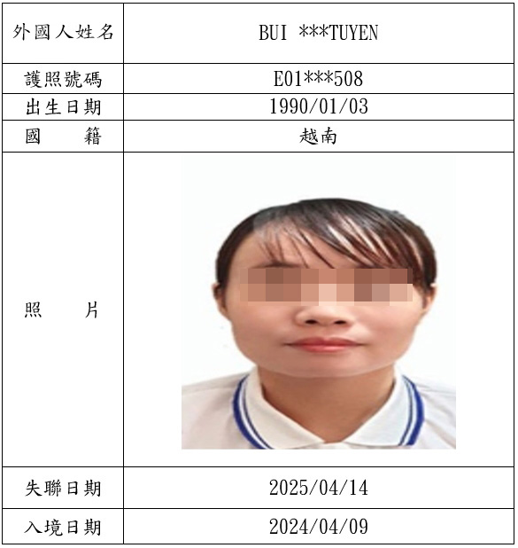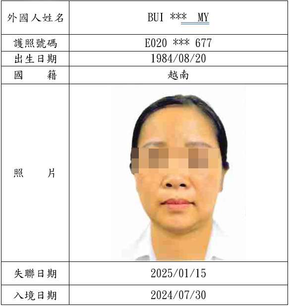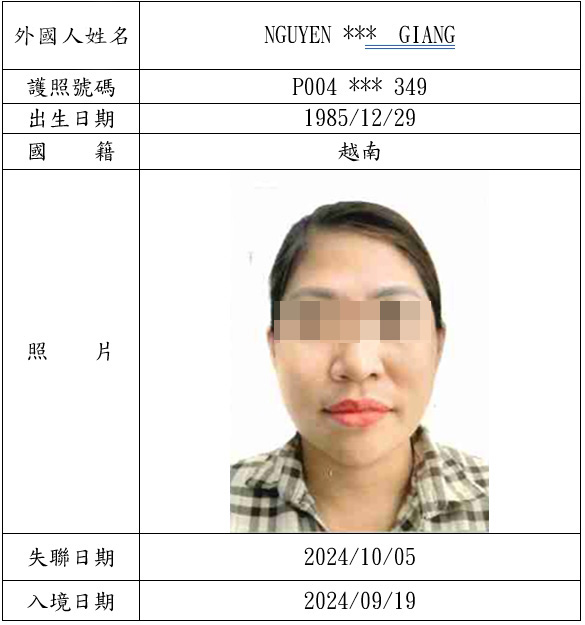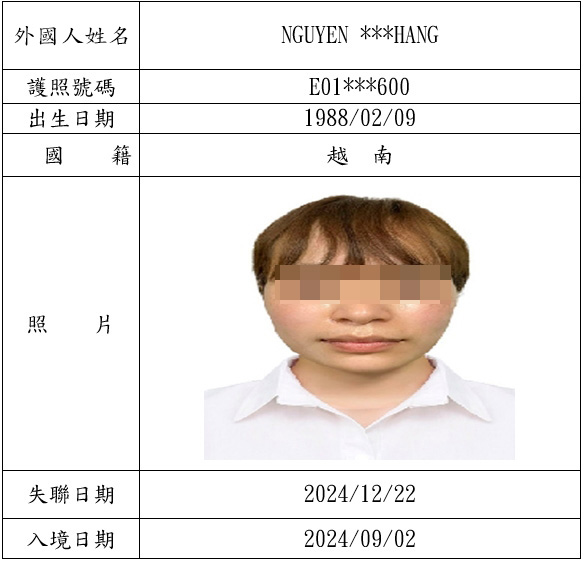 失聯外籍移工協尋,如有尋獲,請聯絡本公司 (02)2331-1998,懸賞獎金$10,000