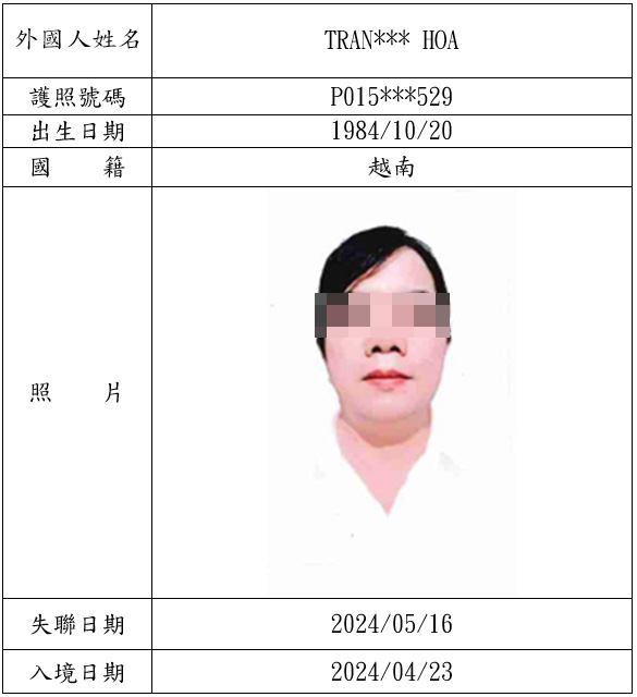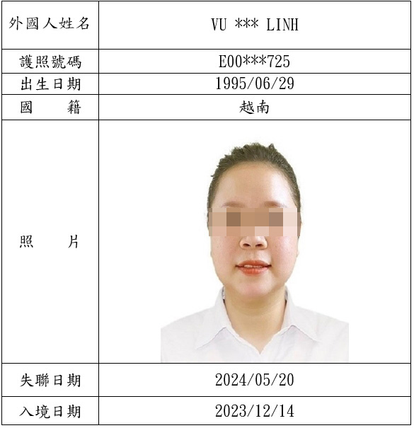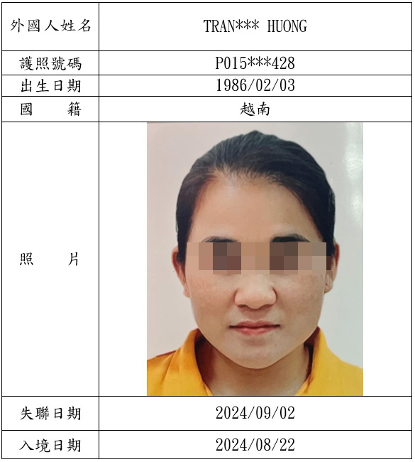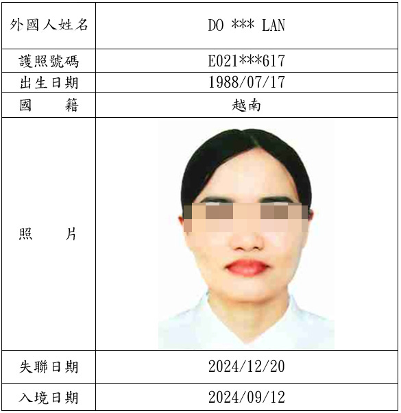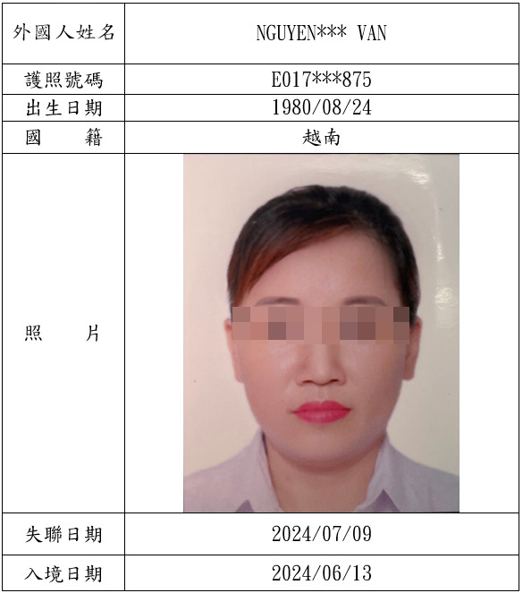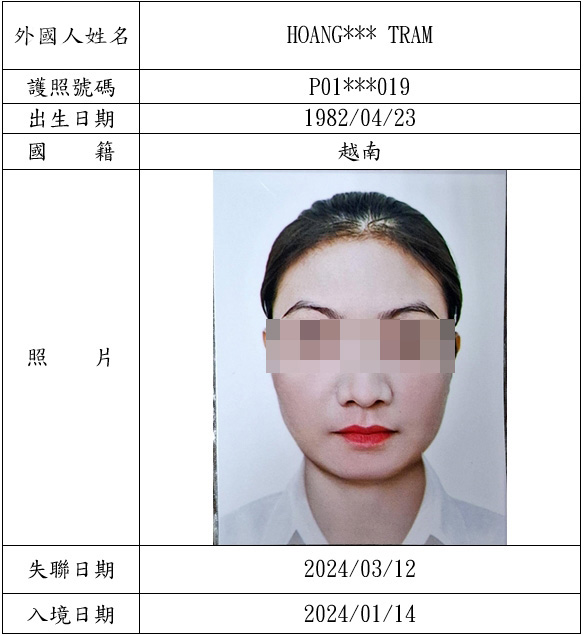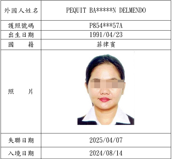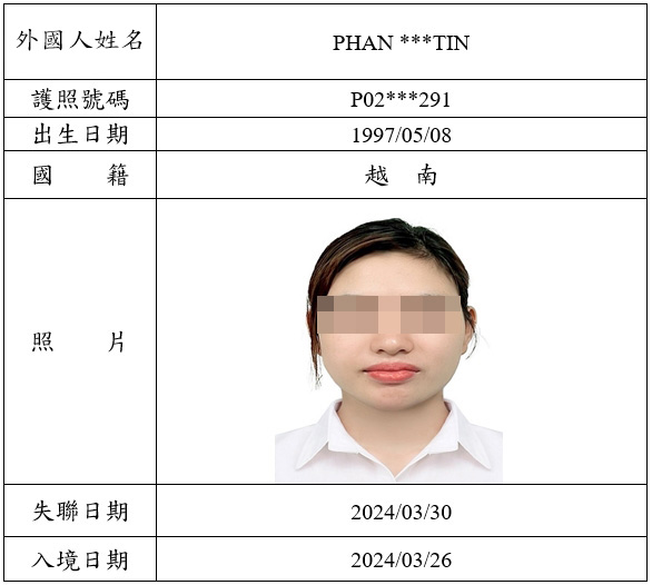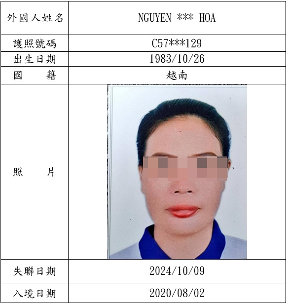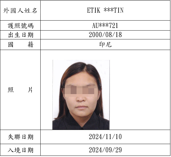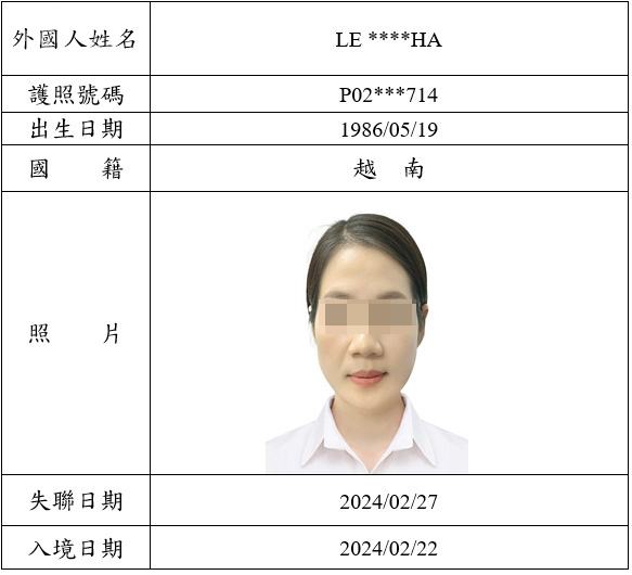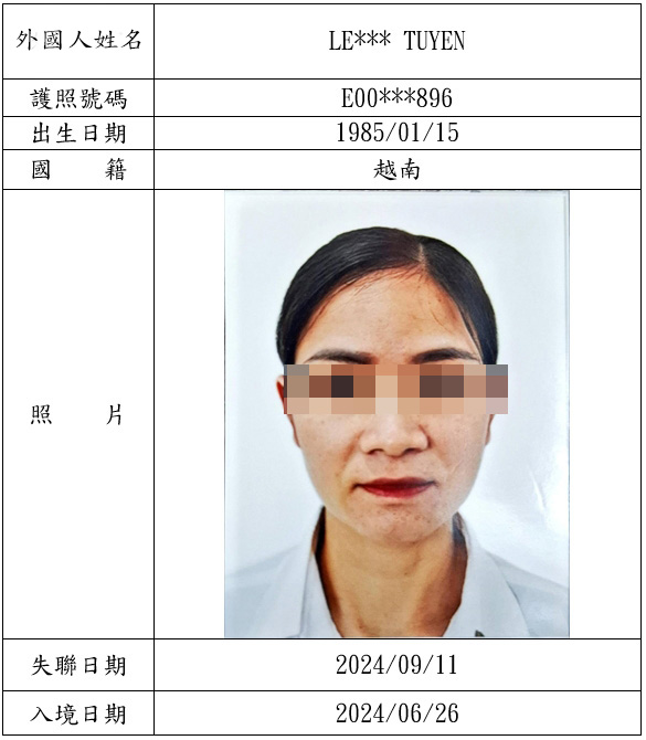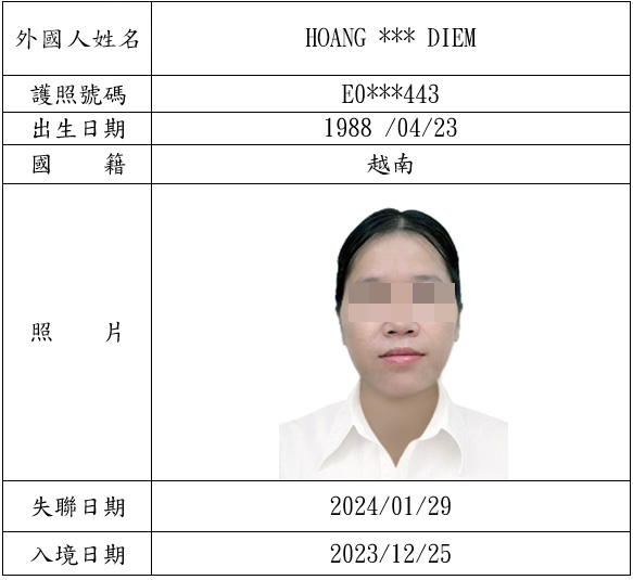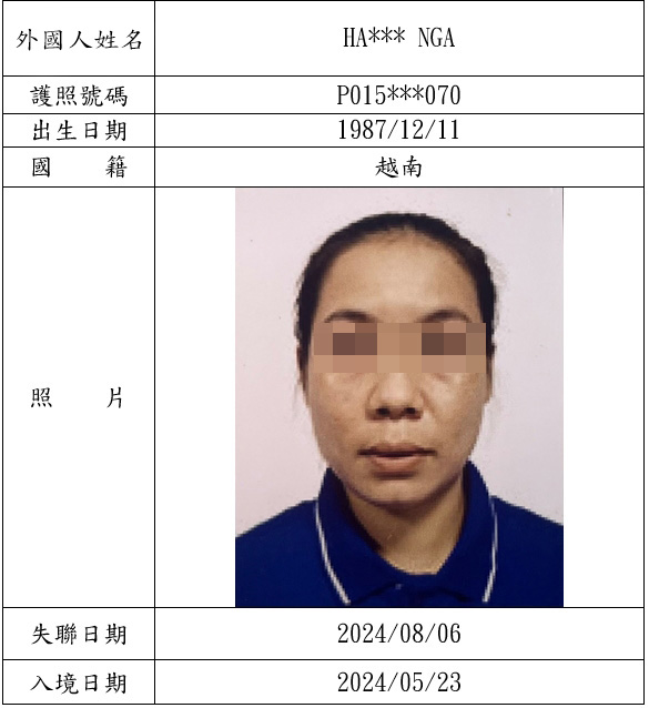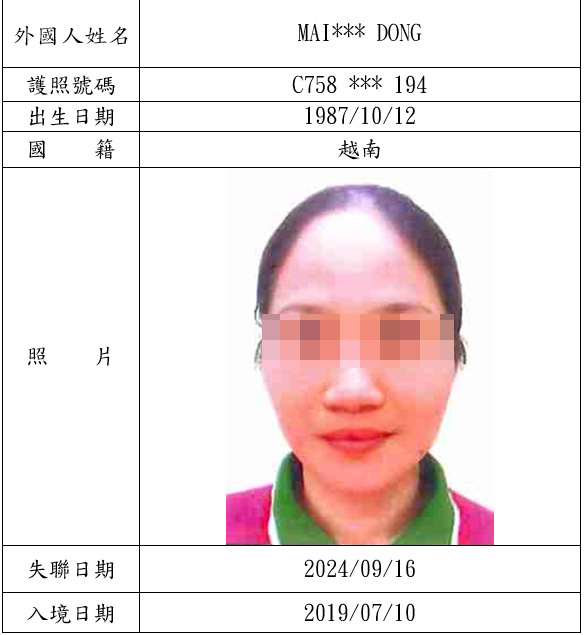 失聯外籍移工協尋,如有尋獲,請聯絡本公司 (02)2331-1998,懸賞獎金$10,000