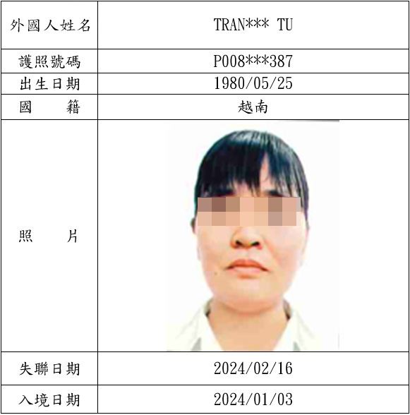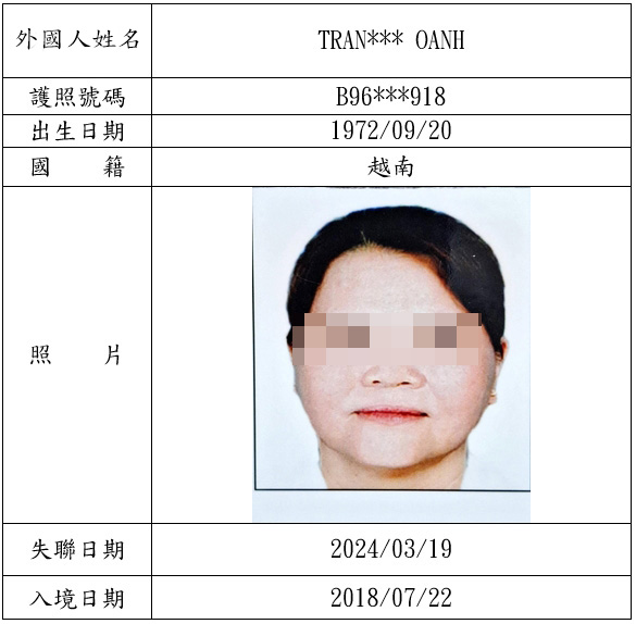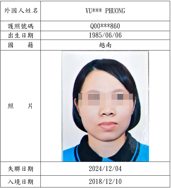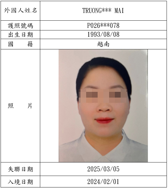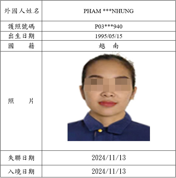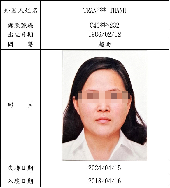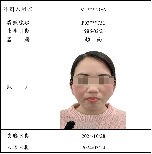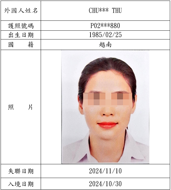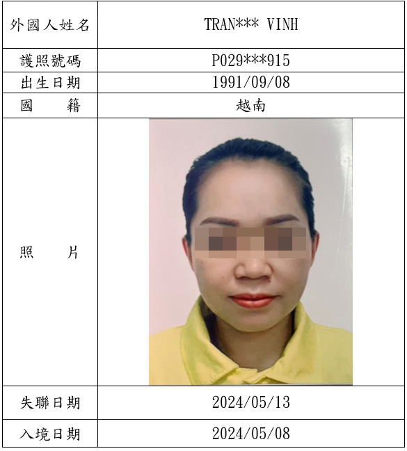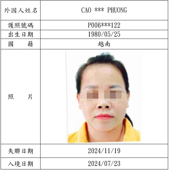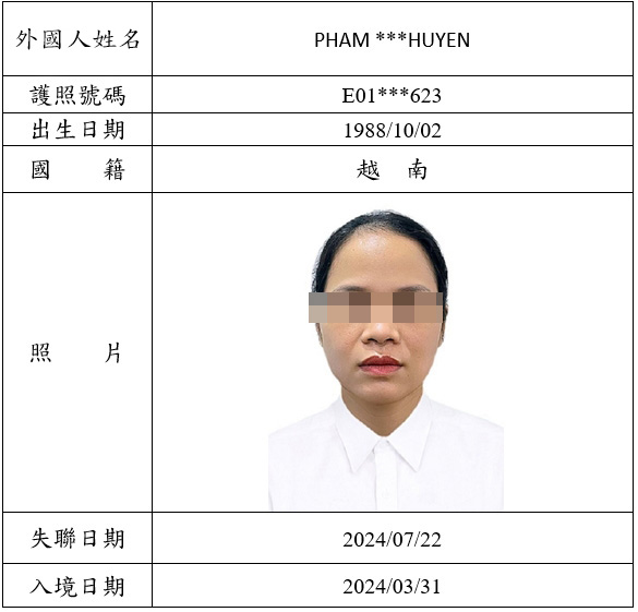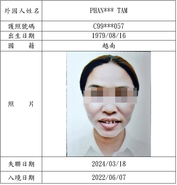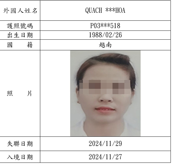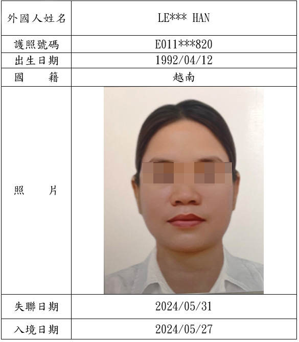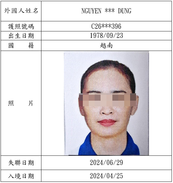 失聯外籍移工協尋,如有尋獲,請聯絡本公司 (02)2331-1998,懸賞獎金$10,000